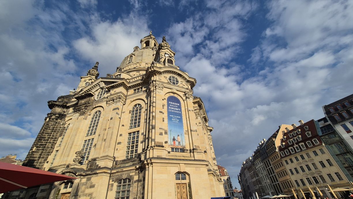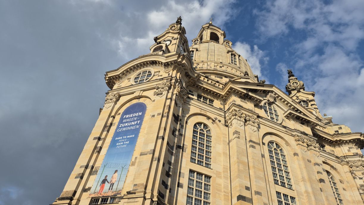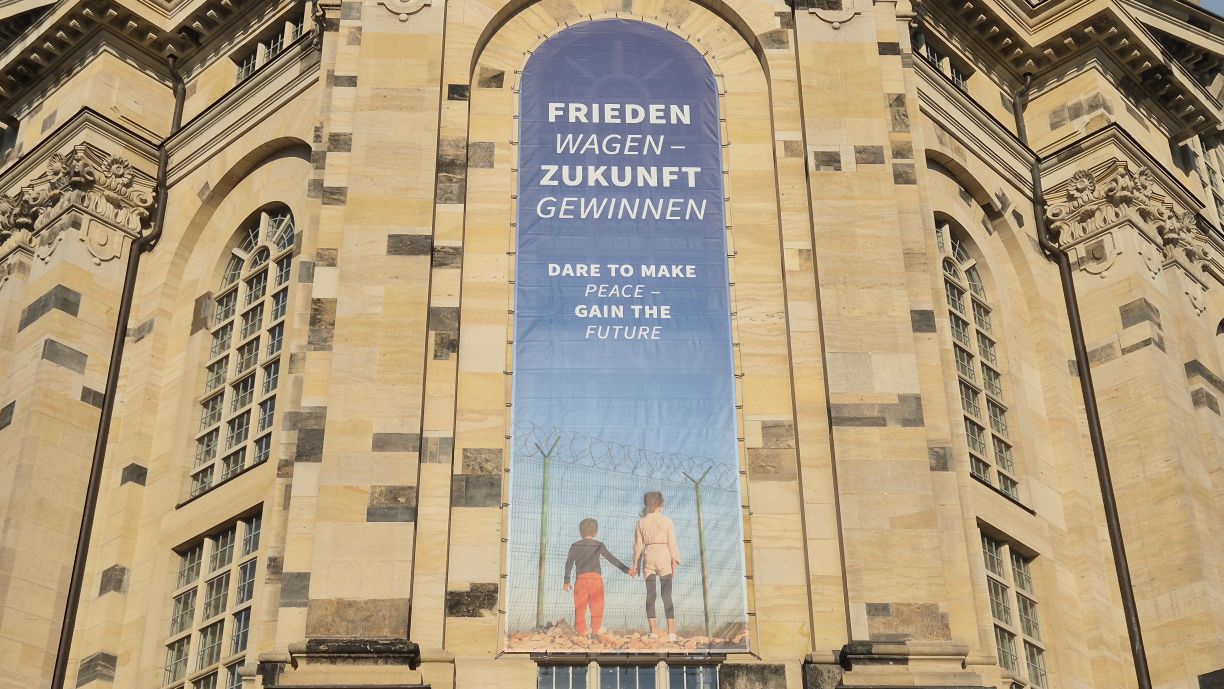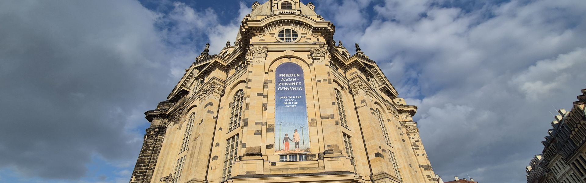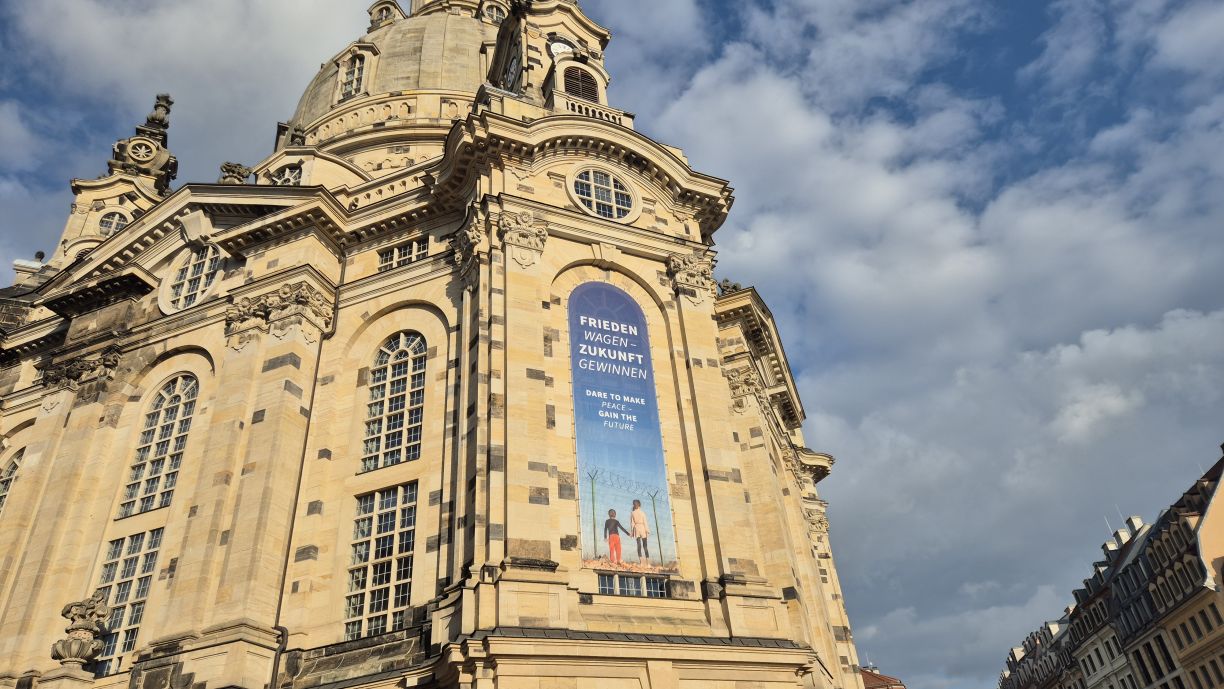Mit einem Banner zeigt die Stiftung Frauenkirche Dresden Haltung: Zukunft entsteht dort, wo Menschen den Mut haben, Frieden nicht nur zu beschwören, sondern ihn politisch zu gestalten – gegen Hass und Angriffe auf unsere Demokratie.