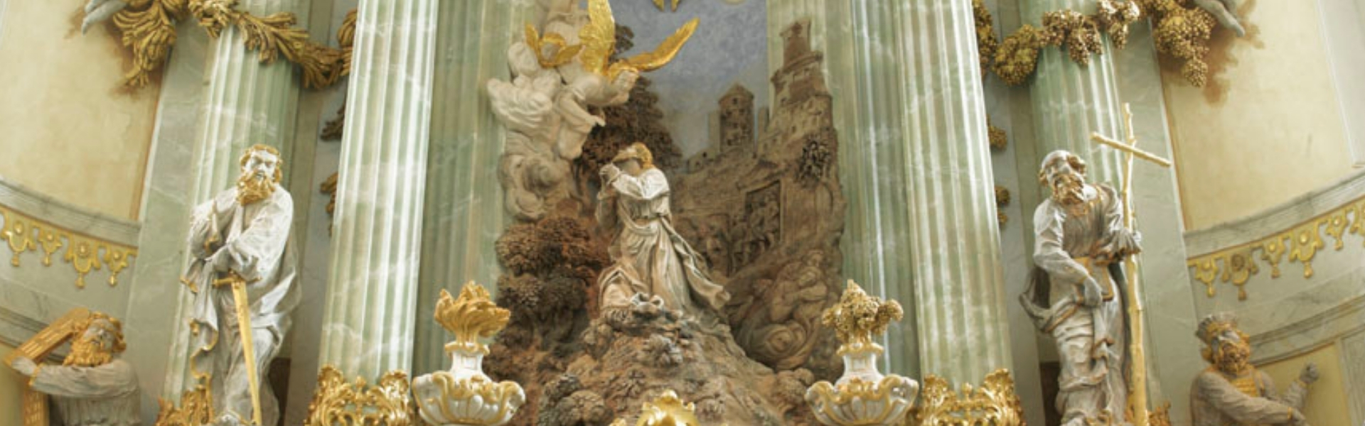 Der Altar der Dresdner Frauenkirche von Johann Christian Feige fasziniert mit seiner barocken Pracht, doch umso mehr mit seiner Botcschaft. Denn beim genaueren Hinschauen entdeckt man in ihm eine steinerne Predigt: die Passionsgeschichte, Heilige des Alten und Neuen Testamentes und Symbole des Heiligen Abendmahls.