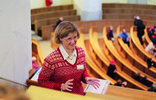 Franca Funke, ehrenamtliche Kirchenführerin seit 2018 »Etwa 2017 stieß ich auf einen Zeitungsartikel, in dem ein Interview mit einem älteren Kirchen führer in der Frauenkirche abgedruckt war. Er sprach leidenschaftlich über seine Rolle als ehrenamtlicher Kirchenführer und erzählte von einem ergreifenden Moment, als eine Gruppe syrischer Besucher zu Tränen gerührt war, als sie den Altar sahen, der den lebendigen Jesus (vor seiner Verhaftung) darstellte – eine einzigartige Darstellung, die so in wenigen Kirchen zu finden ist. Inspiriert von diesem Artikel setzte ich mich mit Frau Dr. Häse in der Stiftung in Verbindung, um mich zu erkundigen, ob ich selbst Kirchenführerin werden könnte.« |