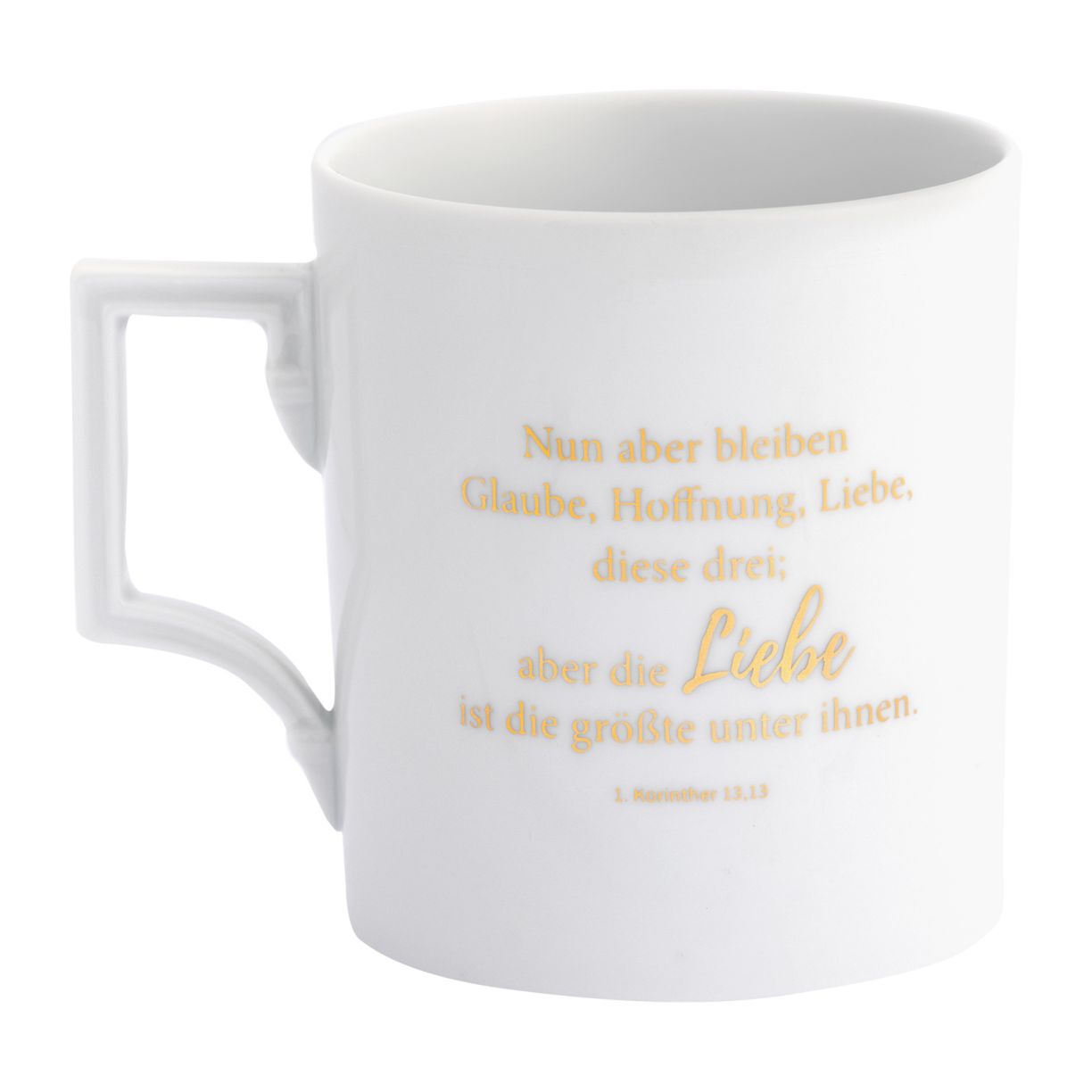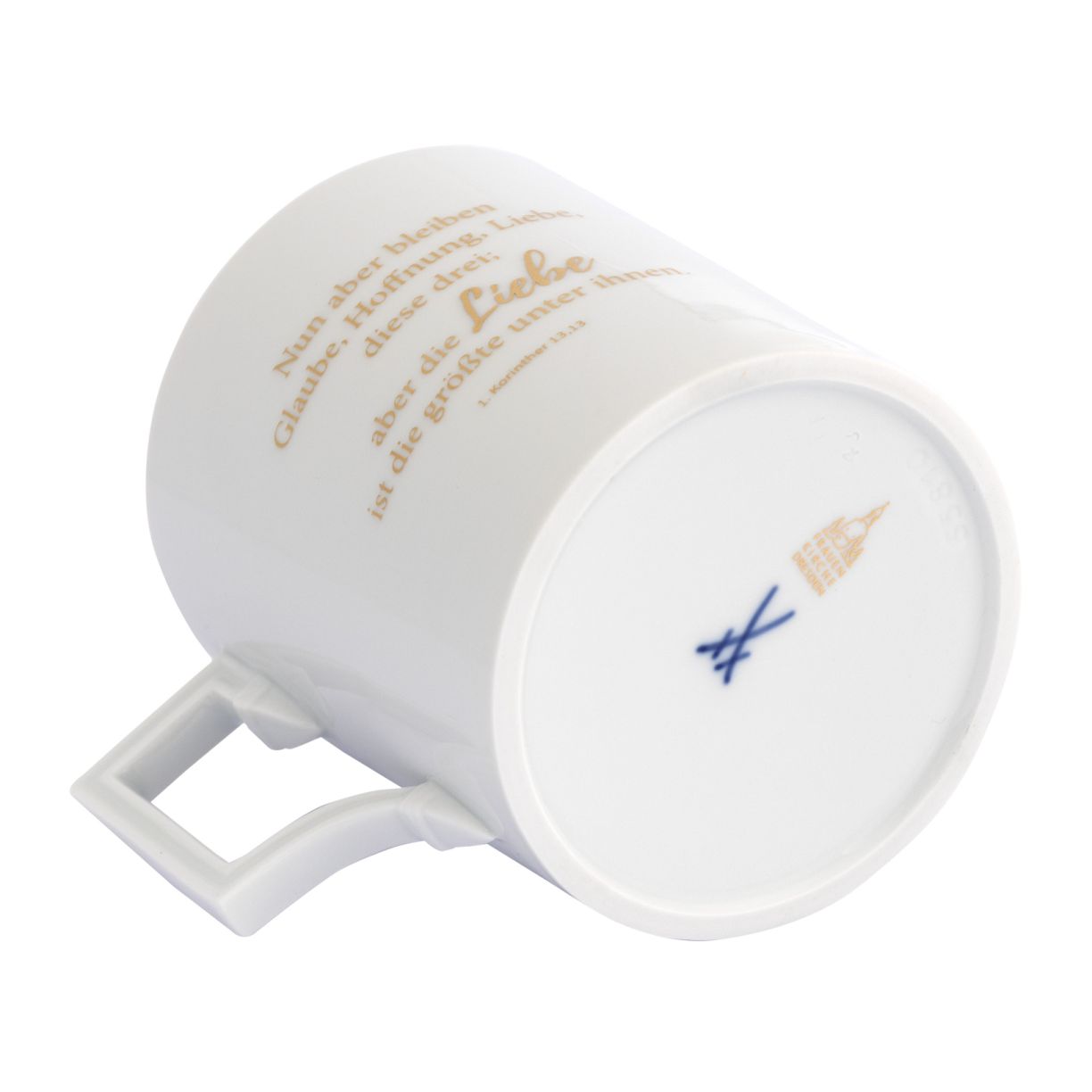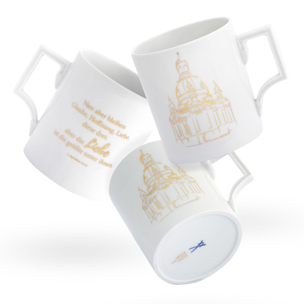 In Kooperation mit der Porzellan-Manufaktur MEISSEN entstand diese elegante und hochwertige Tasse, aus der Tee und Kaffee geleichermaßen genossen werden können. Die exklusive Edition ist mit dem bekannten Bibelvers aus dem Korintherbrief versehen: »Nun aber bleiben Glaube, Hoffnung, Liebe, diese drei; aber die Liebe ist die größte unter ihnen« (1. Korinther 13,13). So wird jeder Schluck zu einer belebenden Erfahrung.