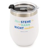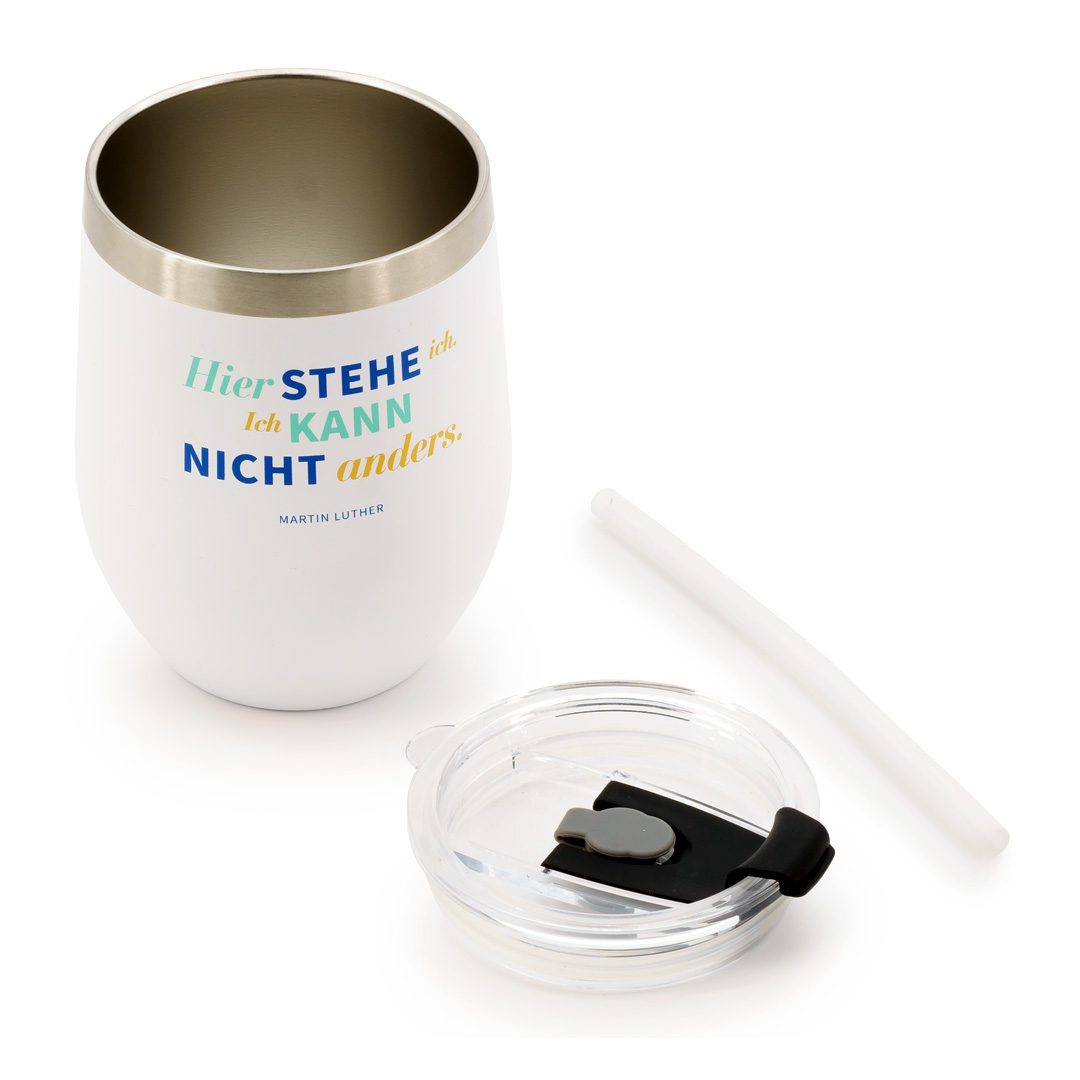 »Hier stehe ich und kann nicht anders« soll Martin Luther einst gesagt haben. Dieser praktische Thermobecher trägt diesen Ausspruch – denn auch er stellt sich ganz in den Dienst der Sache: Getränke warm oder aber auch kalt zu halten. Durch seine handliche Größe und schlichte Gestaltung wird er zu einem verlässlichen Begleiter auf all Ihren Wegen.